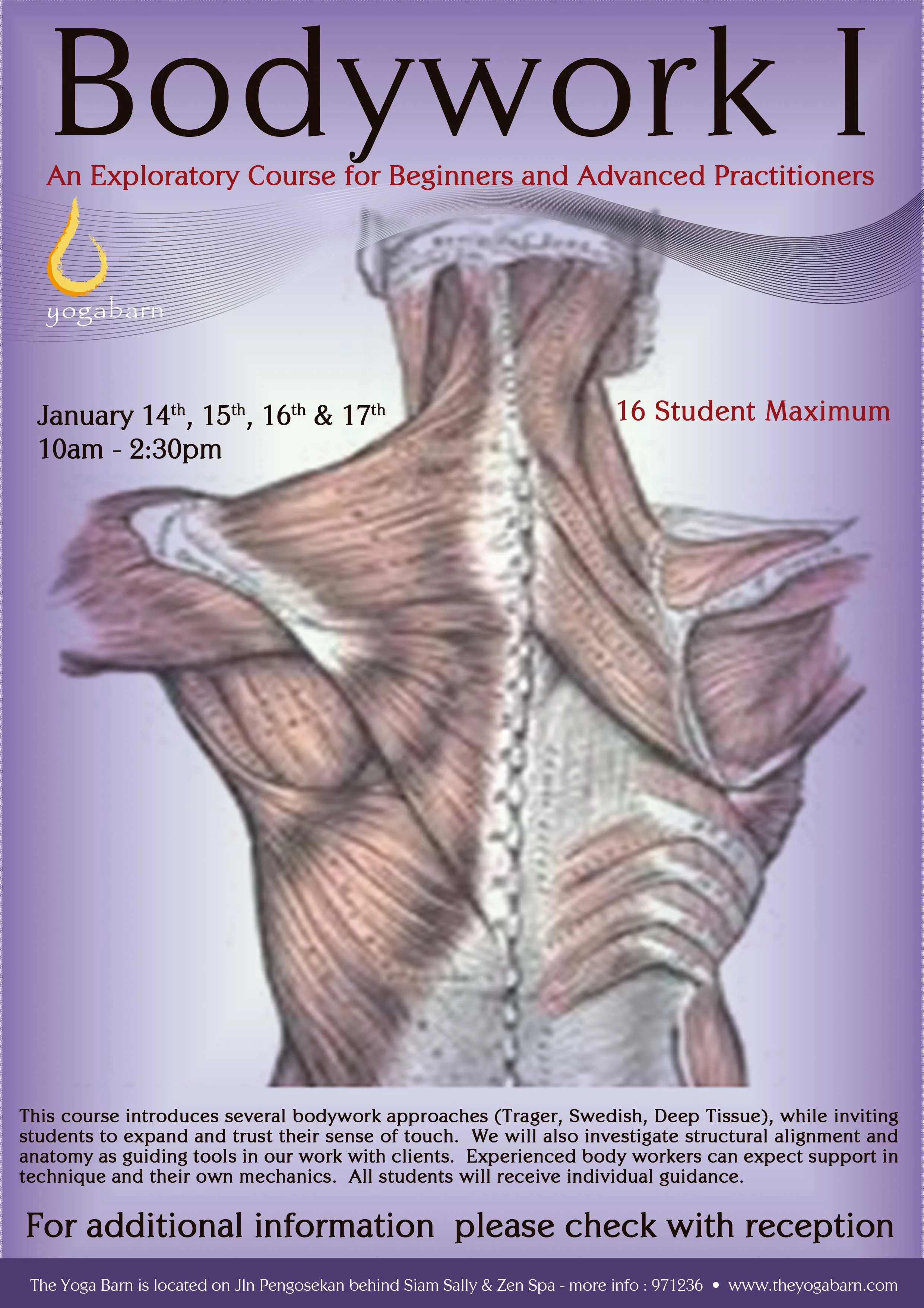 A hands-on exploration of the fundamentals of bodywork. In this course we try delve into a variety of modalities - e.g Trager, Swedish-Esalen, Deep Tissue and Intuitive - as well as begin to build a skill base in techniques of observation. This course is well suited for beginning and novice practitioners of bodywork.